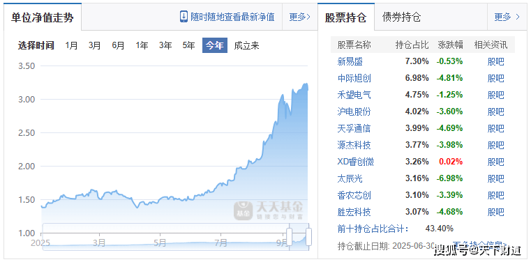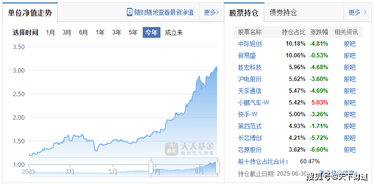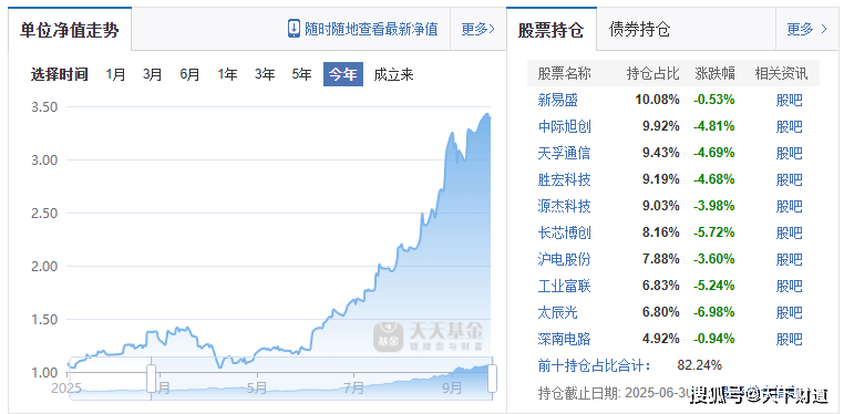 例如,业绩排名第一的永赢科技智选混合发起A,前10大重仓股几乎都属于CPO板块,前三大持仓股正是市场中赫赫有名的“易中天”——新易盛(300502.SZ)、中际旭创(300308.SZ)、天孚通信(300394.SZ),它们今年以来最大涨幅均超过200%。