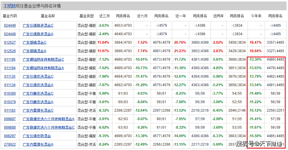 至于排名倒数第二的广发内需增长混合A,其基金经理就是上文提到的王明旭——排名倒数第一的广发价值优势混合,也是他掌管的。