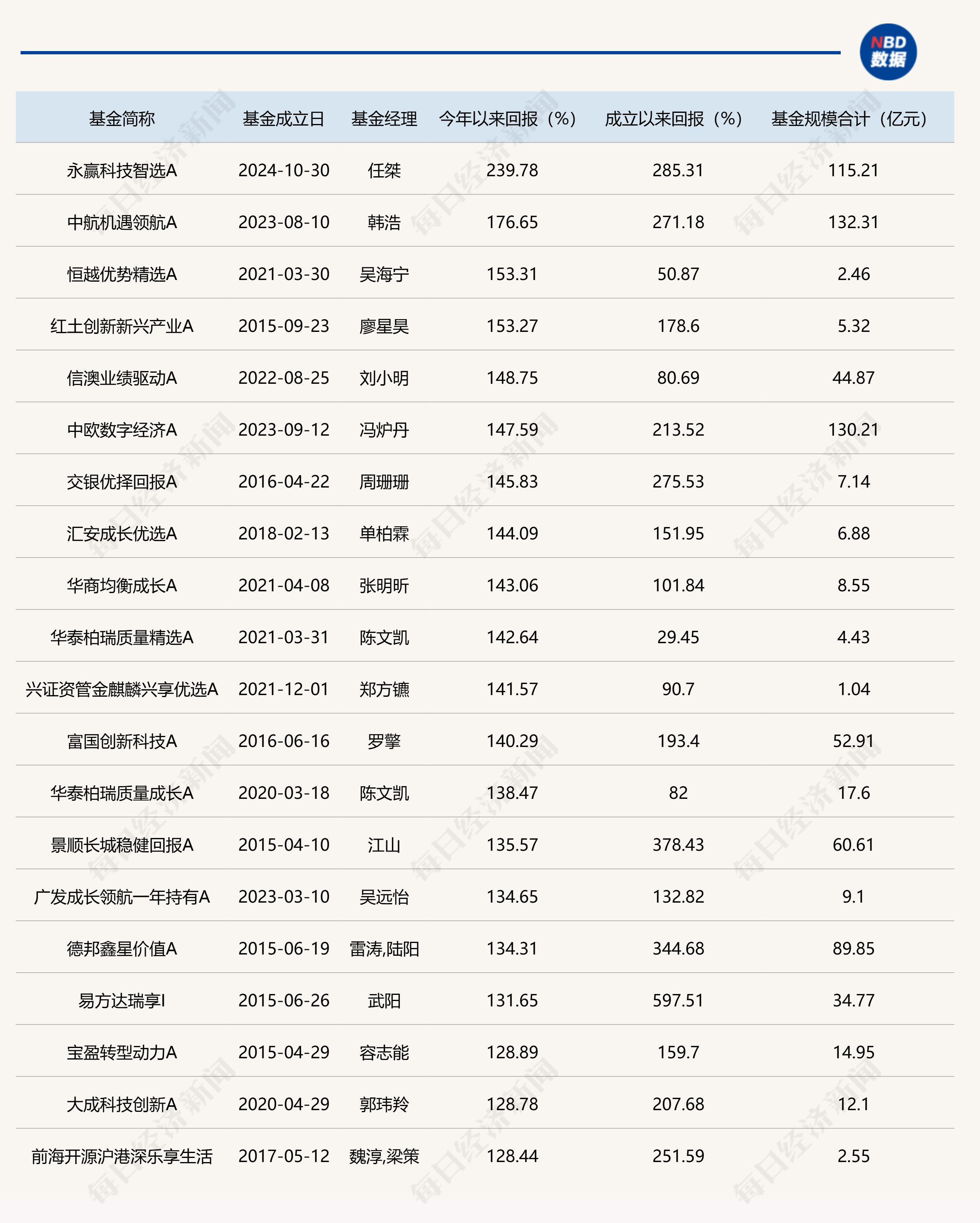 在这其中,永赢科技智选A以239.78%的年内回报领跑混合型基金和全市场主动基金。该产品是今年的“网红”基金代表,凭借出色的业绩表现实现逆袭,规模直接从去年年底不足1亿元飙升至如今的百亿级基金。