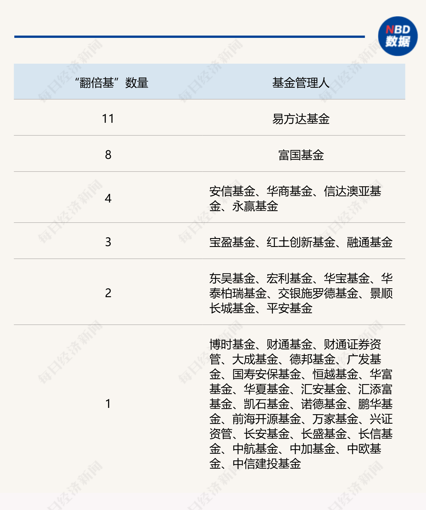 那么问题来了:哪些公司旗下的翻倍基最多?哪些又一只都没有、与行情擦肩而过?话不多说,先来看统计: