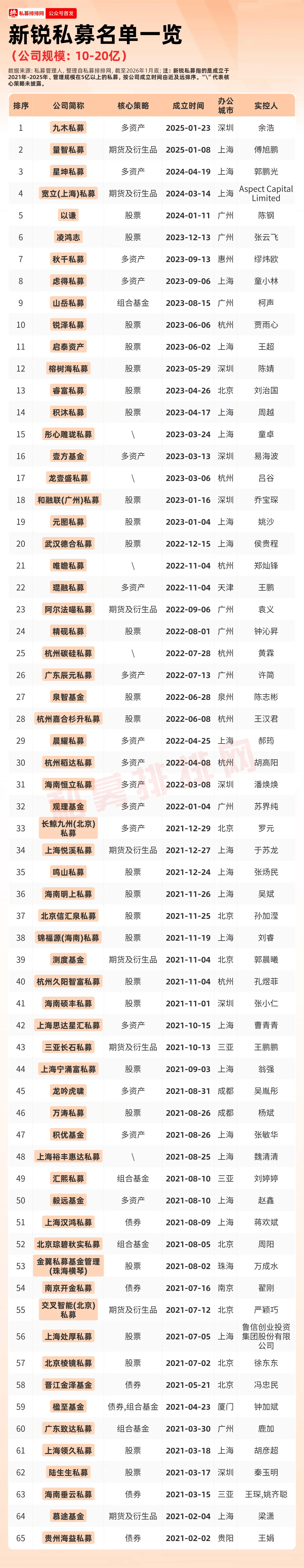 在规模为10-20亿的私募中,新锐私募共有65家。从具体的成立日期来看,2021年成立的私募超过30家,2023年、2022年成立的私募超过10家。从实控人的类型来看,机构实控的私募有2家,分别为外资实控的宽立(上海)私募,以及具有国资创投背景的上海处厚私募。从办公城市来看,上海地区的私募数量较多,有23家;另外,北京、杭州、广州、深圳均有超过5家公司在列。