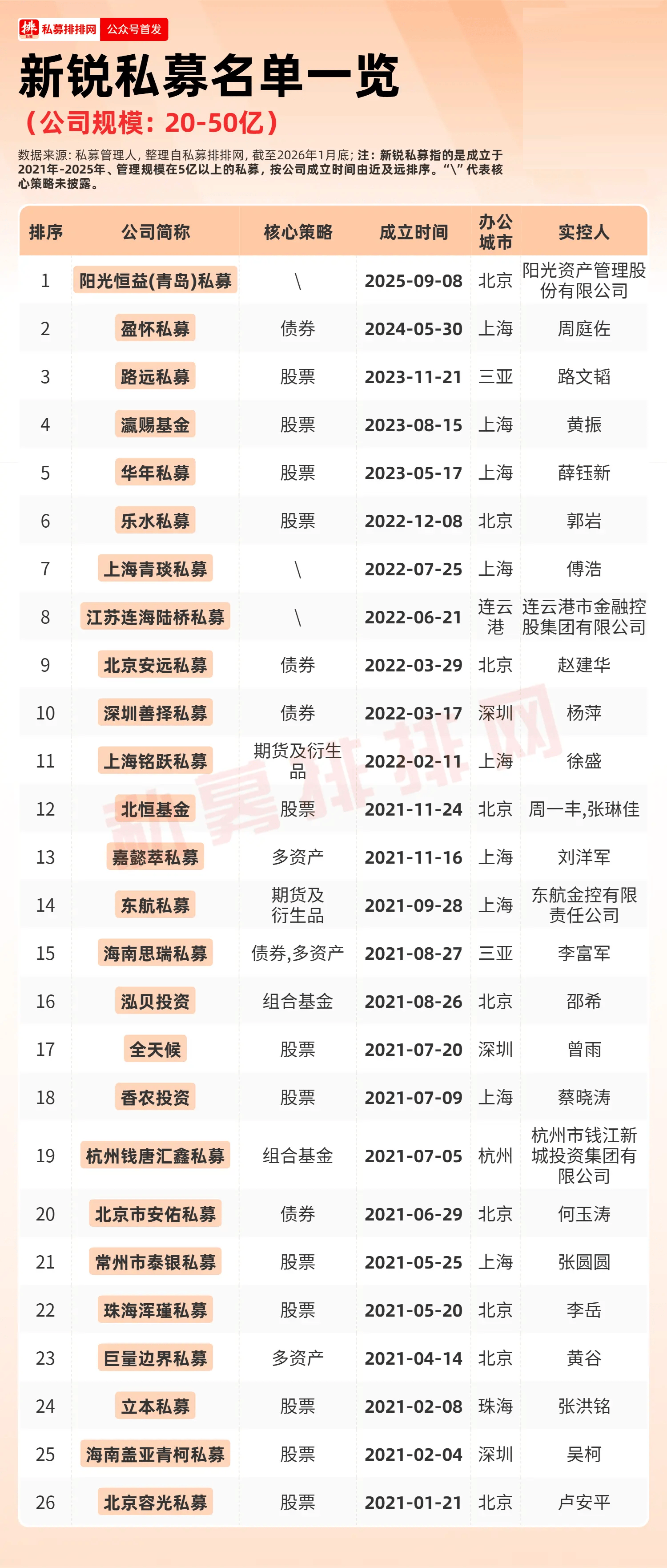 在规模为20-50亿的私募中,新锐私募共有26家。从成立时间来看,2021年成立的公司有15家,占比过半;从实控人类型来看,机构实控的私募有4家,其余为自然人实控;从办公城市来看,上海、北京各有9家,数量较多。