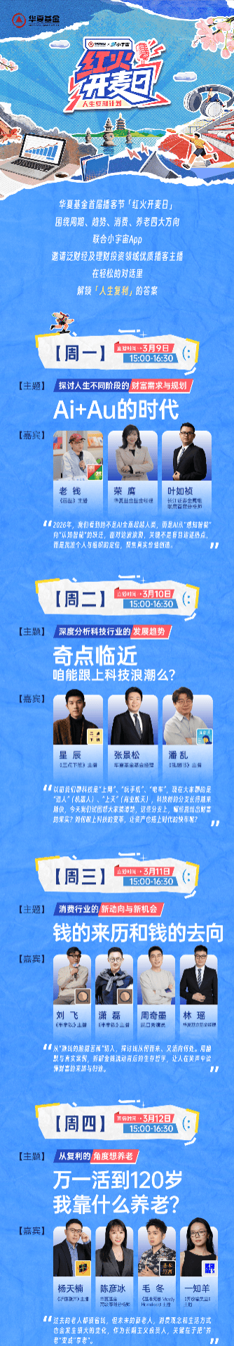 本次播客节以“探索人生复利”为核心命题,围绕周期、趋势、消费、养老四大方向设置四大品牌论坛,邀请泛财经及理财投资领域的优质播客主播,与华夏基金投研团队展开深度对话。