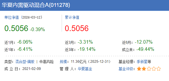 主动权益的颓势最终落在产品业绩上,华夏多只权益基金已套牢基民。以季新星为例,其现任基金资产总规模仅11.86亿元,在管产品最佳任期回报-49.24%——直接来自华夏内需驱动混合A/C,两只基金自2021年2月成立以来累计亏损分别达49.44%和51.21%,净值徘徊在0.5元左右。过往管理的华夏稳盛灵活配置混合、华夏翔阳两年定开混合亏损分别达16.92%和35.23%。