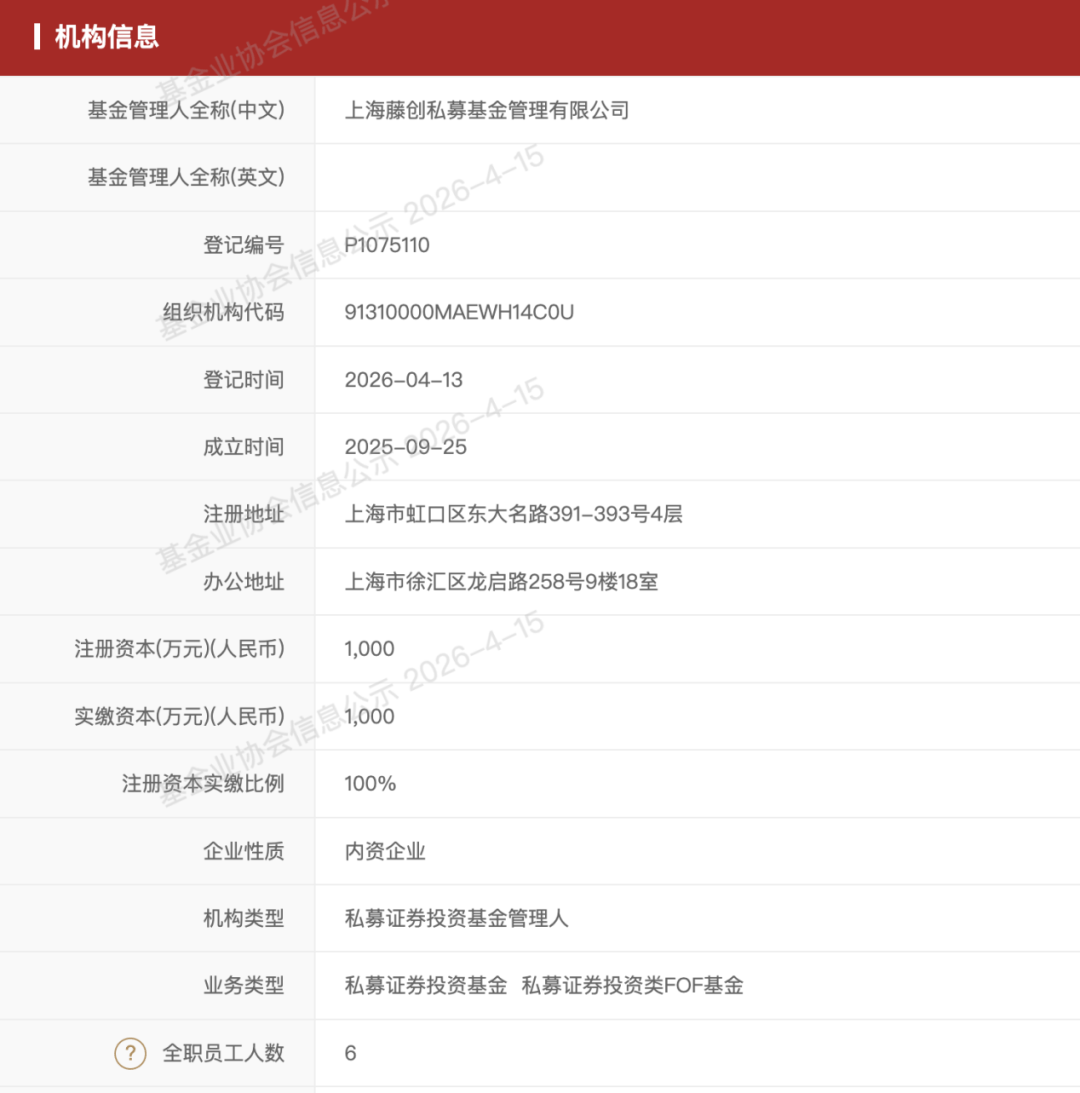 公开资料显示,藤创私募成立于2025年9月,注册资本为1000万元,机构类型为私募证券投资基金管理人,有全职员工6人。