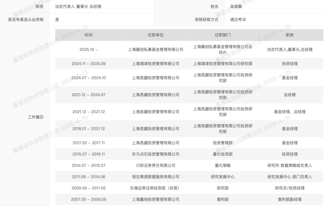 从思勰投资退出后,2024年11月,吴家麒加入了一家主观多头私募,在涌津投资研究部担任投资经理。2025年9月,吴家麒一手创办的藤创私募正式成立。