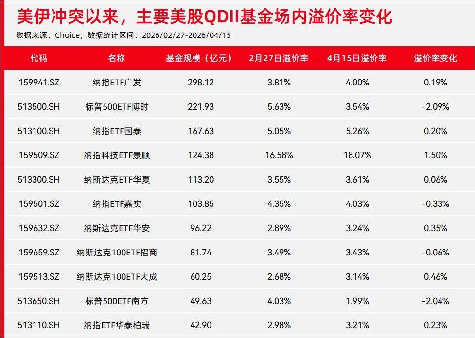 从主要美股ETF溢价变化情况来看,与美伊冲突爆发前相比,纳指ETF普遍溢价率变化幅度较小,标普500ETF溢价率下降2%左右。