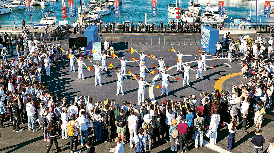 北部战区海军舰艇开放活动在青岛奥帆中心码头举行。图为官兵进行旗语展示。刘再耀摄
