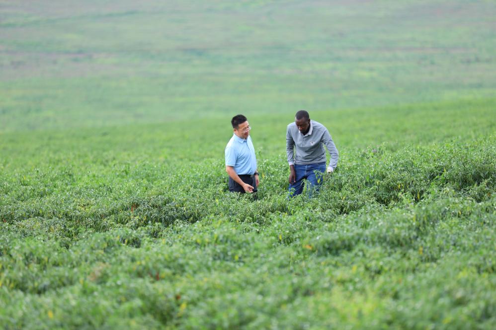 2025年5月22日,在卢旺达加绍拉农场,湘农国际非洲商务代表与当地农业技术员查看辣椒长势。新华社记者吉莉摄
