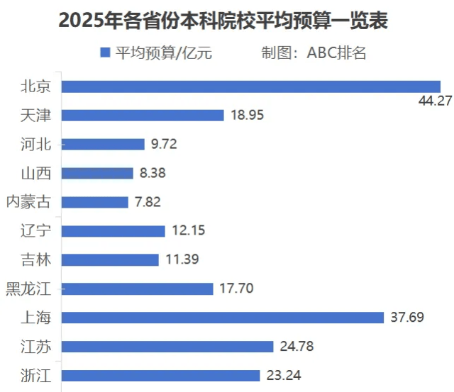 而中国大学排行榜(CNUR)网站发布的2025年中国大学年度预算经费统计,为我们揭开了不同高校的“底气”差异:北京以44.27亿元的本科院校平均预算位居全国首位,这样的优势既源于首都的资源集聚效应,更离不开国家对北京高校发展的重点倾斜。
