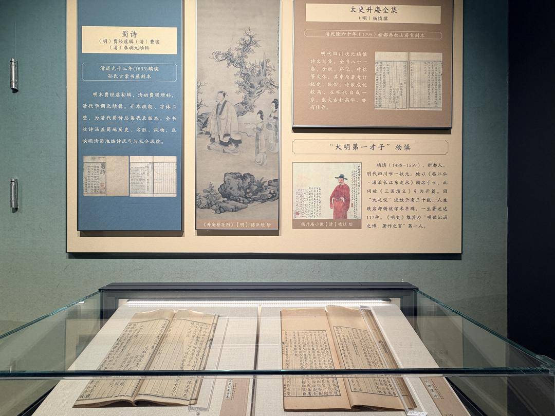 “其中,‘锦城书事’是此次展览中最具特色的单元,展现出强烈的地域叙事。我们围绕着成都文脉这一主题,选取了大量和成都有关的馆藏文献典籍。”肖娇娇谈到,其打破了按年代或材质分类的常规模式,转而以“古籍中的成都”为主线,编织出一部立体的城市传记。