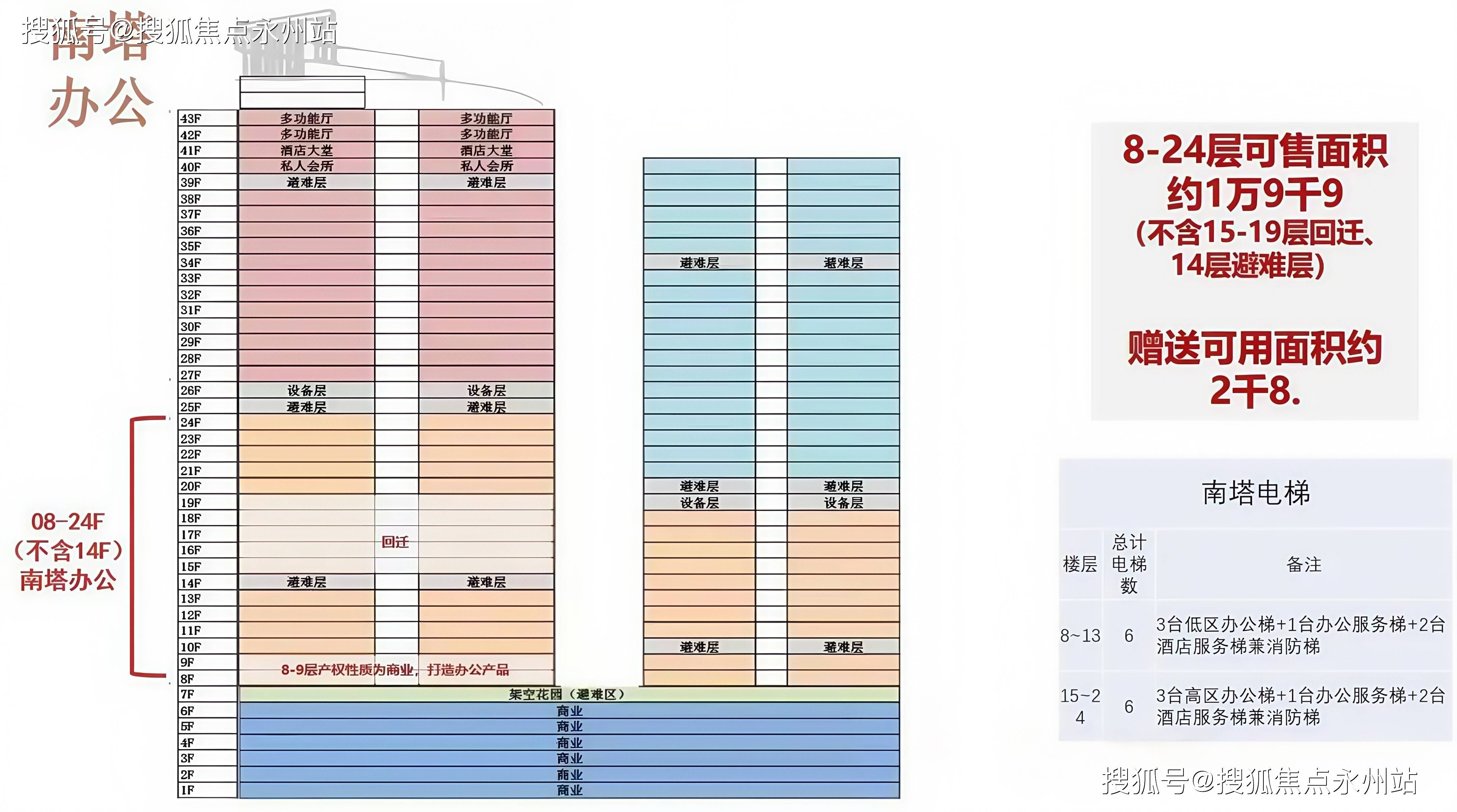 写字楼产品:在售建面约98-2168㎡甲级写字楼,主力面积段为154-314㎡,标准层面积约1748-2168㎡,实用率约62%,物业费暂定32元/㎡/月(含空调费),写字楼位于南塔8-24层,配备9台日立电梯(含服务梯与消防梯),大堂挑高10米,配套直升机停机坪,定位为深港门户商务地标。