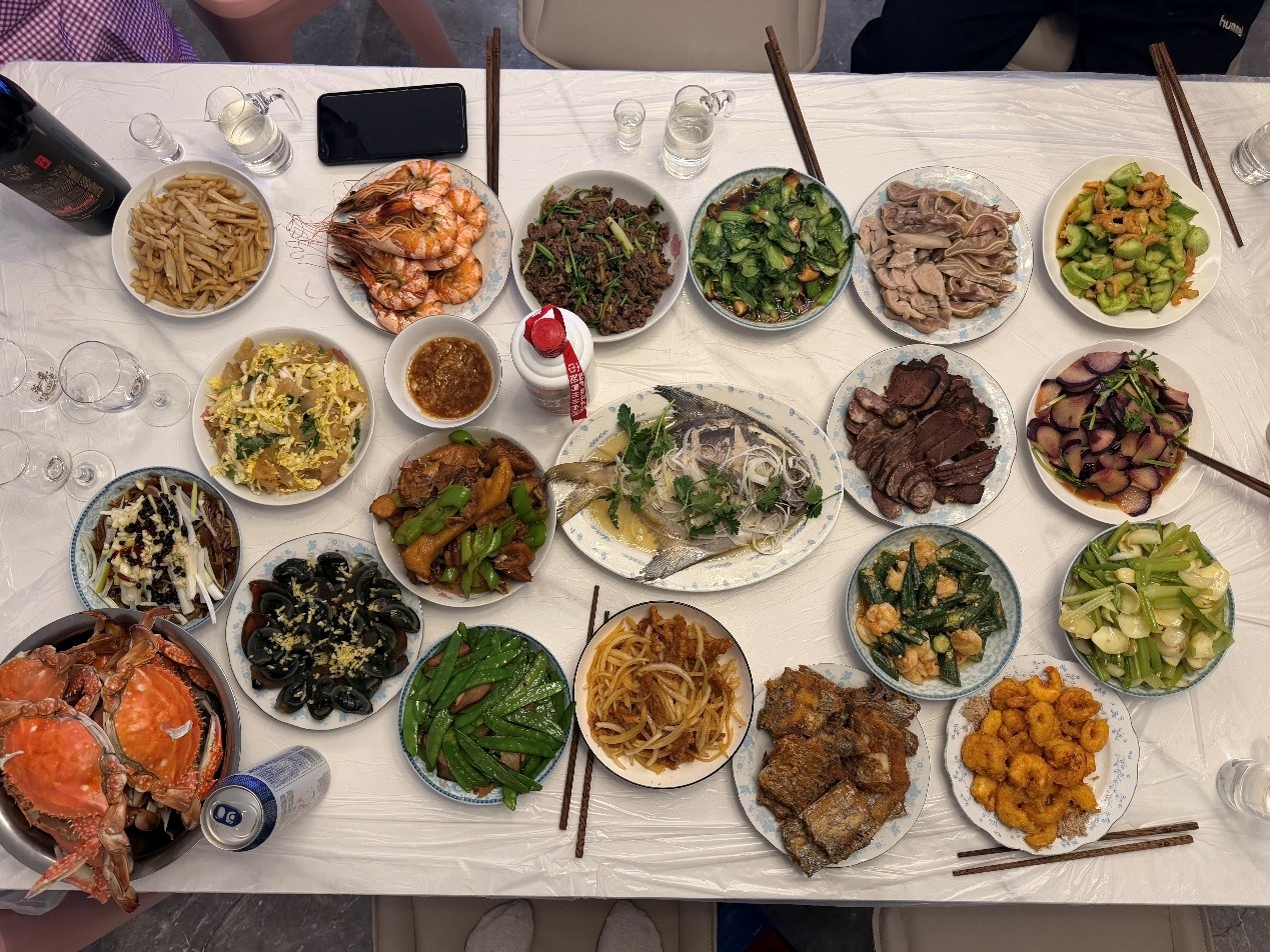 年夜饭格外丰盛,菜品几乎人均三道。大虾、螃蟹,还有青岛人最爱的鲅鱼水饺摆满餐盘,春晚在一旁轻声播放。杯盏相碰、碗筷轻敲的声响,与电视里旋律交织在一起,汇成一曲节日的交响。