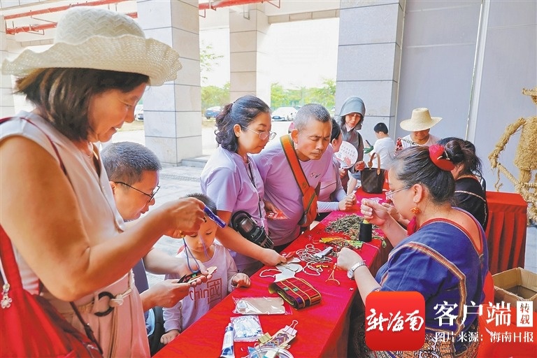 活动现场设置了非遗技艺展演区、非遗产品展区、非遗互动体验区、主题拍照打卡区及非遗保护成果图片展等功能区域,全方位呈现白沙独具特色的民族传统文化。在技艺展演区,身着民族服饰的表演者放声歌唱,悠扬的民族歌声吸引市民游客驻足聆听,大家还手牵手围成一圈欢乐互动。在非遗产品展区中,黎锦文创、山兰酒、鱼茶、黎陶摆件等特色好物琳琅满目,产品融入黎族文化元素,实用又美观。