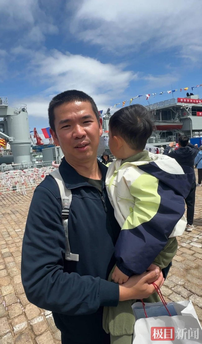 22日当天,高云峰身穿体能服,抱着孩子来到青岛港三号码头。他表示近距离感受军舰与在屏幕上观看有很大不同。他计划明年有机会的话带学校的同学们一起来参观,接受国防教育。参观结束后,高云峰还表示要回去和学校的孩子们分享这次难忘的经历,表达他的激动和自豪之情。